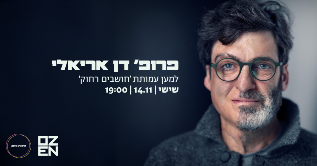 14/11/2025 18:00 אמונות שווא – למה אנחנו מאמינים בדברים לא הגיוניים? פרופ’ דן אריאלי למען עמותת ‘חושבים רחוק’ מאיפה מגיעות האמונות שלנו? האם אנחנו באמת בטוחים במה שאנחנו מאמינים או שאולי אנחנו מחזיקים בעמדות בלי באמת להבין אותן לעומק? בעולם שבו יש כל כך הרבה דעות וכל כך הרבה אינפורמציה וכל כך הרבה דיסאינפורמציה, איך