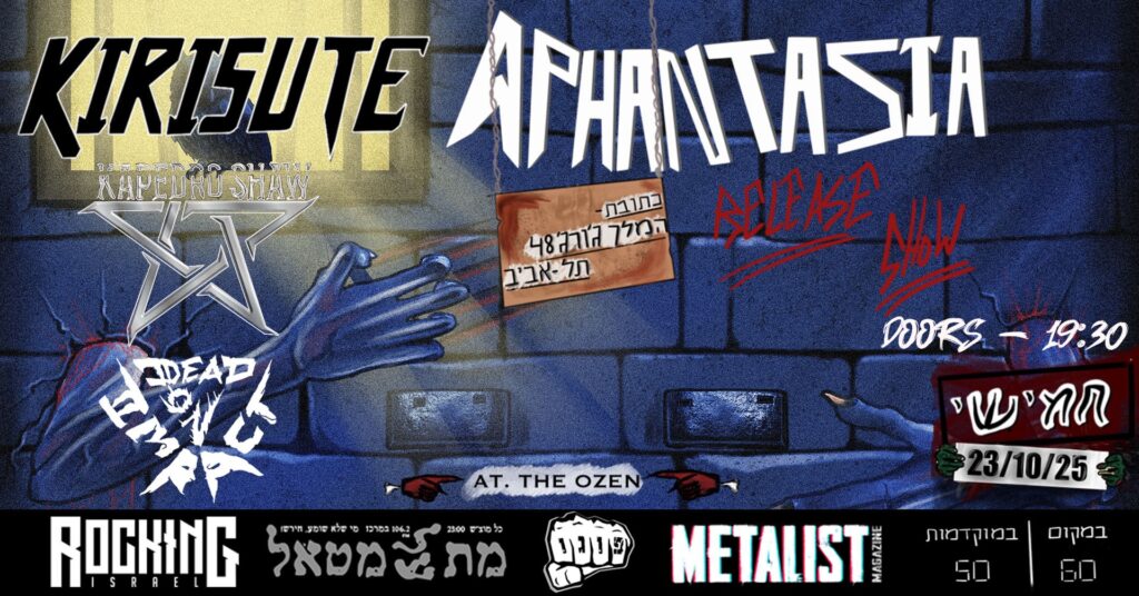 23/10/2025 19:30 ב23.10 Kirisute תעלה להשיק את הסינגל השלישי שלה Aphantasia. כמובן על במת האוזן בתל אביב יעלו בנוסף הלהקות, KAPEDRO-SHAW וDEAD-ON-IMPACT להכין לכם את הערב טראש שלא תוכלו לשכוח. תכינו ווסטים, מגפיים ואטמי אוזניים כי בערב הזה הולכת להיות ההופעה הכי רועשת בתל אביב. הלהקה שתתן את המנה הראשונה והכואבת לערב תיהיה…!! הלהקה שתפתח