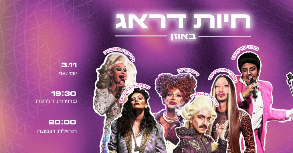 03/11/2025 19:30 אוהבות מוזיקה? אוהבים דראג? ב3.11 הפקת הענק חיות דראג מגיעה לאוזן בתל אביב – 7 זמרות, 5 נגנים, 2 זמרות ליווי ו-1 ערב חד פעמי✨🌈❤️ לכרטיסים: ♛חיות דראג♛ – המופע המוזיקלי בו הזמרות הן מלכות ומלכי דראג👑🎤 הצטרפו למסע של רוק, פופ, ג׳אז, מזרחית, בלוז, מיזוקולז, סול, דיסקו ושלל הפתעות במפגש בין פרפורמנס