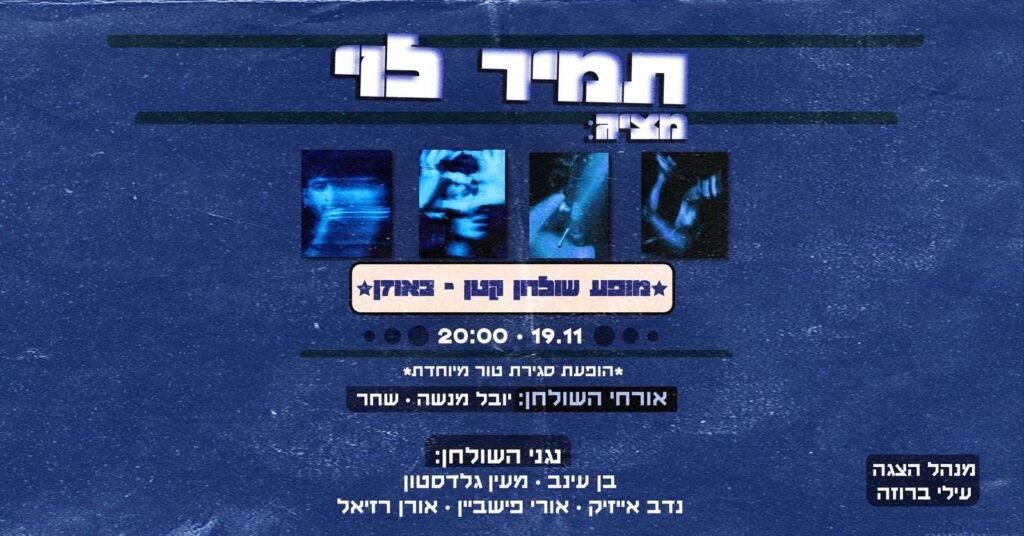 19/11/2025 19:30 תמיר לוי, אומן אר אנד בי חדש בארץ. חוצה ג׳אנרים ומציג ליין הופעות חדש לאלבום הראשון השלו ״איזור נוחות״. שם המופע – שולחן קטן. ביחד עם הרכב הבית שלו מציג את האלבום שלו בתצורת טייני דסק ישראלי, משם הגיע גם שם המופע, שולחן קטן. ההופעה היא הופעה חוצה ג׳אנרים שנעה על התפר בין
