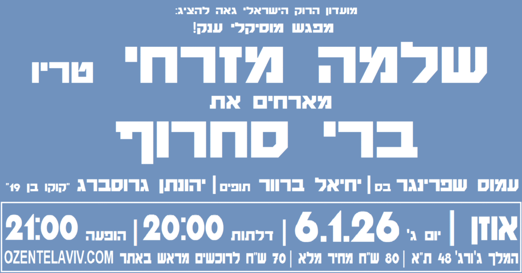 06/01/2026 20:00 מועדון הרוק הישראלי גאה להציג: מפגש מוסיקלי ענק! שלמה מזרחי טריו מארחים את ברי סחרוף שלמה מזרחי הוא גיטריסט וירטואוז, זמר, מלחין ומפיק, והוא מוכר בכינוי "ג'ימי הנדריקס הישראלי". הוא נחשב לאחד מחלוצי הרוק והבלוז בישראל בזכות חברותו בלהקות "הבמה החשמלית", "כף התקווה הטובה" ועוד. לאחר פעילות מוסיקלית מוצלחת באירופה, חזר לישראל ופיתח