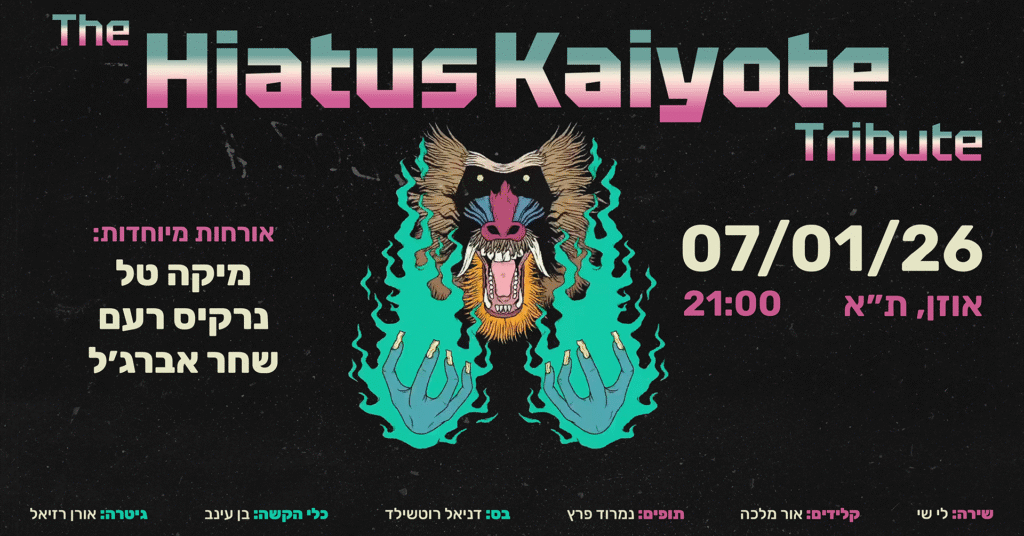 07/01/2026 21:00 The Hiatus Kaiyote Tribute מופע חד־פעמי שמוקדש כולו להרכב הניאו־סול האגדי מאוסטרליה, Hiatus Kaiyote — הלהקה שהשפיעה על אינספור מוזיקאים ברחבי העולם. לכבוד עשור לאלבום האייקוני Choose Your Weapon, נעלה לבמה עם ביצועים חיים ומרגשים לשירים מכל האלבומים בערב מלא בניאו סול ואר אנד בי, עם 3 אורחות מיוחדות שצמחו והושפעו מהלהקה והז׳אנר: